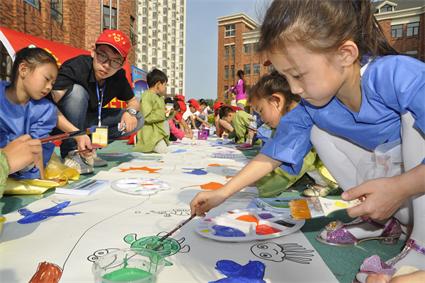 学生党员与小朋友们一起进行我心中的蓝色海洋涂鸦 |