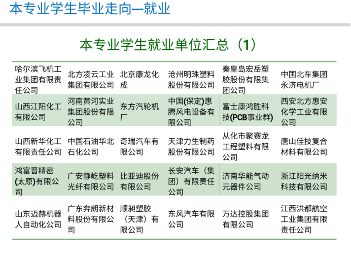 高分子材料与工程专业毕业生就业面广,可就业行业包括高分子材料生产加工、石油化工、汽车制造、生物医药、精密仪器加工、能源材料以及教育科研等领域,近几年的就业单位主要包括哈飞基团、北方凌云工业、比亚迪汽车、长城汽车、天津力生制药、立邦涂料、中石油等企业。高分子材料相关的科学研究在助力人工智能、5G建设、医疗防护等领域发挥着这关键的作用,很多本科生也选择毕业继续深造,近年来高分子专业的应届考研率保持在41%以上,主要去向包括中科院化学所、北航、川大、北化、天大、哈工大等。综合考研和就业,专业的一次就业率一直保持在95%以上。欢迎全国考生报考燕山大学高分子材料科学与工程专业。