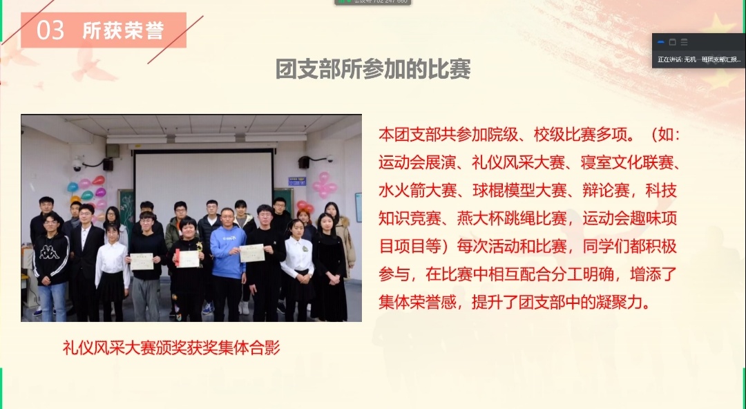 团支部风采大赛是五四文化艺术节系列活动之一,以进一步加强基层团组织建设,深入贯彻习近平总书记系列重要讲话精神,坚持不懈地以习近平新时代中国特色社会主义思想武装团学干部和团员学生头脑、指导团学工作实践为主要目的,本次大赛共五个环节,分别是“海报制作彰才华”、“团日活动增凝聚”、“团课讲座学思想”、“青年学习增底气”和“支部表演展风采”。大赛环节环环相扣,设计海报展现支部风采和学科特色,注重培养大学生的创新能力;各团支部开展了以青春奋进为主题的团日活动,在深入学习五四精神的同时,也用自己的方式表达了对抗疫逆行者的深深敬意和对祖国的美好祝愿;团课学习中,那一个个彰显了中国速度与中国力量抗疫故事,让团员青年们更加坚定了制度自信;“青年大学习”网上主题团课,团员青年更加深刻的理解了传承五四精神;支部风采展示了各团支部积极向上、不断拼搏创新的精神及对母校的热爱之情,在实践中让五四精神、中国精神绽放更加夺目的新时代光芒。