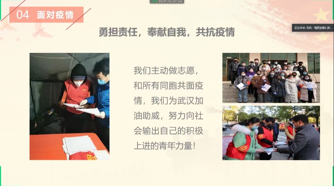 党委书记李曦达老师作为主讲人,以《疫情下的五四精神与中国精神》为题,讲述青年人谱写的时代赞歌和新时代下的五四精神,全院师生200余人入会聆听。借此,为期35天的“绽放战疫青春,献礼百年燕大”——Esball官网