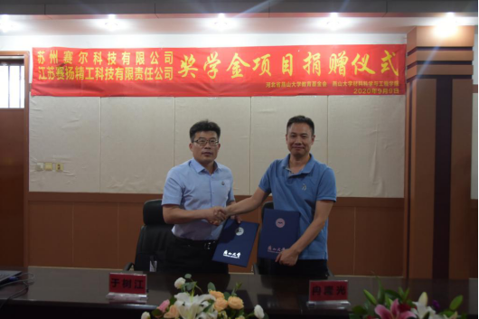 9月9日下午4:30,江苏赛扬精工科技有限责任公司、苏州赛尔科技有限公司奖学金项目捐赠仪式于材料A馆325室举行。燕山大学党委常委、副校长于树江,江苏赛扬精工科技有限责任公司总经理王凯平,苏州赛尔科技有限公司总经理冉隆光,Esball官网