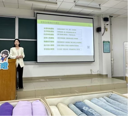 专题讲座环节,学院特别邀请了专业的收纳整理讲师,在西区第二教学楼108房间,从空间规划、分类摆放、折叠艺术、工具使用、智慧收纳、持之以恒等6个方面,引导学生明确寝室区域的功能划分和有效收纳的重要性;通过演示与实践,使同学们掌握“直立折叠”技巧,同时合理利用辅助工具实现空间的有效扩展和物品的合理归置;鼓励学生将所学技巧融入日常,形成定期整理的习惯,让整洁有序成为生活的一部分,享受由内而外的改变与提升。
