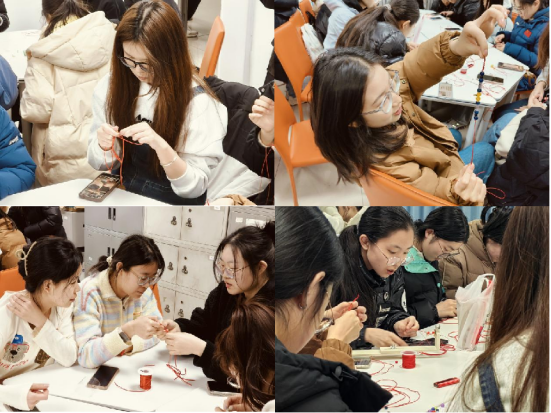 活动开始时,工作人员向大家介绍了绳结编织的基本知识和技巧,让每一位参与者都能亲手编织出属于自己的作品,同学们不时交流着编织心得和经验,互相学习和借鉴。活动进行中,红绳金线丝丝缠绕,璀璨明珠闪闪发光,尽管初学者困难重重,但没有人轻言放弃,材料学子积极应对挑战,互相支持互相帮助,亲手编织着属于自己的独特手链,亲身体验到传统技艺的魅力。