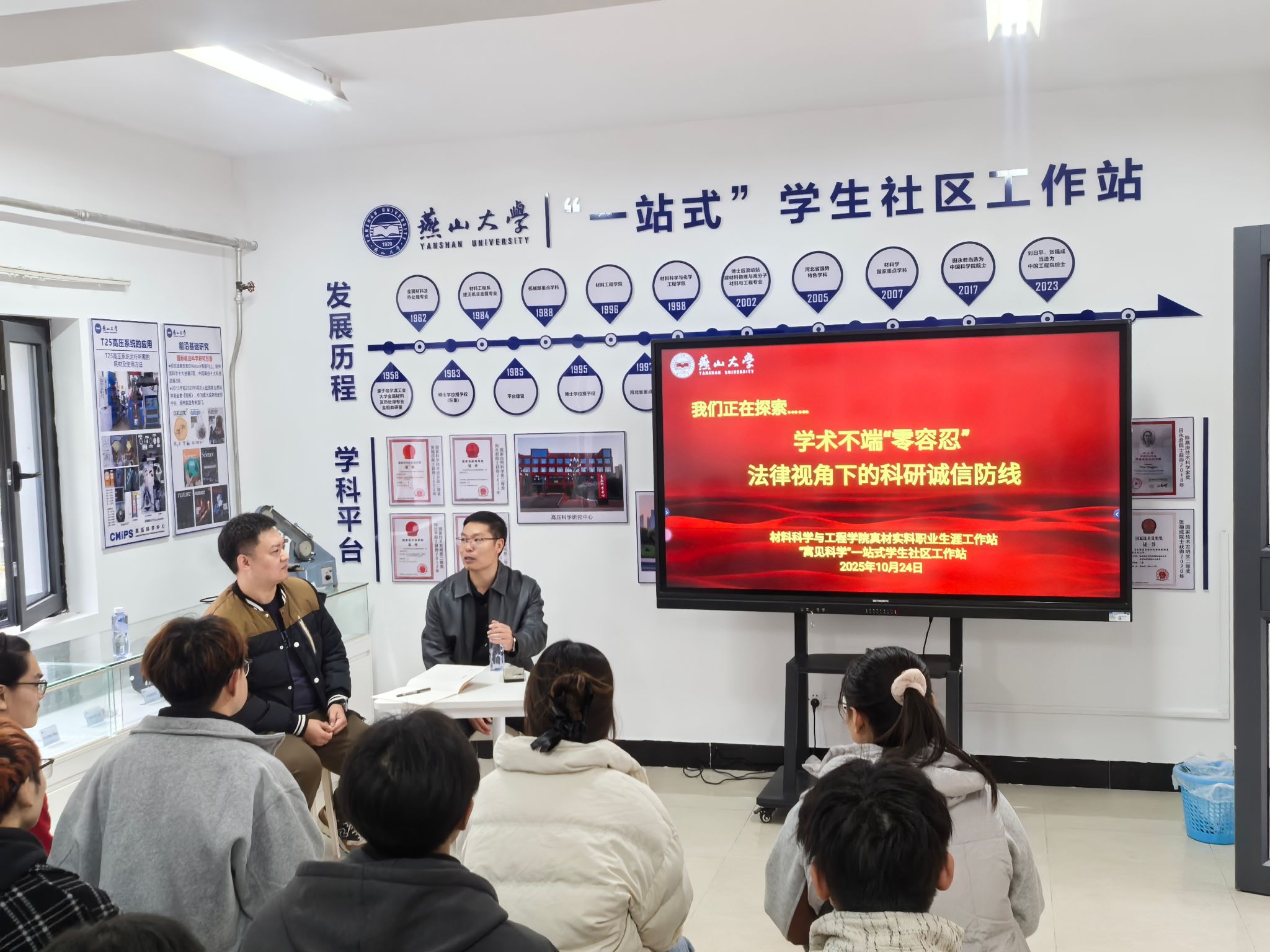 06级金属材料专业校友、河北圣央岚图律师事务所合伙人律师刘瑾,带来“学术不端‘零容忍’:法律视角下的科研诚信防线”主题讲座,用真实案例为大家插接学术诚信密码,学院金属材料工程系系主任李艺君老师主持。