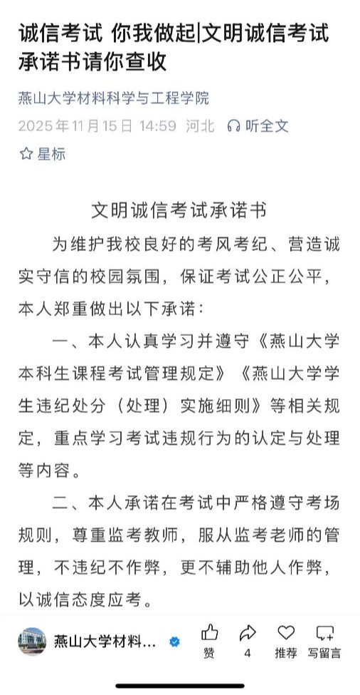 考前,学院通过主题班会、专题讲座、线上倡议书等多种形式,组织学生深入学习《违纪处分实施细则第二十六条》有关规定,结合典型违纪作弊案例进行警示教育;学院微信公众号发布“诚信考试 你我做起|文明诚信考试承诺书请你查收”推文,让学生深刻认识诚信考试的重要性,引导学生树立“诚信应考、以考促学”的正确观念,摒弃侥幸心理,以真实成绩检验学习成效。