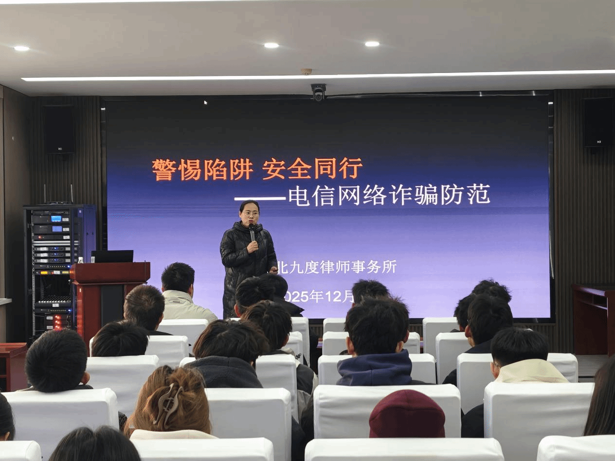 特邀河北九度律师事务所曾获“秦皇岛市十佳青年律师”等荣誉称号的高庆萍律师,开展“警惕陷阱 安全同行”电信网络诈骗防范专题讲座,为师生们送上一堂生动实用的法治安全教育课,讲座由辅导员冯晶主持。