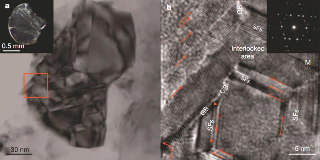 到目前为止,通过石墨、非晶碳、玻璃碳和C60等碳前驱体的高压相变还不能获得纳米孪晶结构金刚石。为此,田永君教授研究团队及其合作者开始研究洋葱碳在高温高压下的相变过程。在较低温度下洋葱碳在形成纳米孪晶结构立方金刚石的同时还共生出一种单斜结构的金刚石,在文章中他们将其命名为“M-diamond”;在较高温度下,碳洋葱转变成了单相的纳米孪晶结构金刚石,孪晶的平均厚度小到5nm。这种纳米孪晶金刚石具有从未有过的硬度和稳定性:维氏硬度约为天然金刚石的两倍,可达200GPa;空气中的起始氧化温度比天然金刚石高出200摄氏度以上。