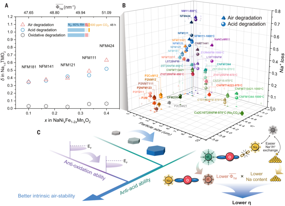 同时,研究团队还开发了一种基于滴定气相色谱技术的标准化空气稳定性测试方法,用以定量评价不同反应路径的贡献和不同材料的空气稳定性。根据30余种材料劣化后钠损失量的定量结果及前期研究成果,综合各组成的离子势和初始钠含量,定义了阳离子竞争系数η,并发现:酸性降解主导了大多数材料的劣化反应;通过减小阳离子竞争系数和增大材料粒径大小可以有效提升材料的抗酸能力;通过选择高电位的氧化还原对可以有效提升材料抗氧化能力主要因素。综合上述手段,同时引入潜在的表面和碱金属层优化,改性材料Na0.96Ca0.02Cu0.1Ni0.35Fe0.1Mn0.2Ti0.25O2的钠损失量可由模型材料的0.489降低至0.019(减少了96%)。研究成果对设计空气稳定的钠离子电池层状氧化物正极材料具有重要的指导作用。